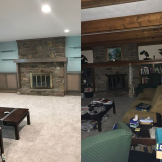 In the family room we worked to make both necessary repairs as well as a few requested changes. In addition to the electrical and HVAC that was completed throughout the house, we removed and replaced the drywall in all rooms as well. Much to our surprise there was paneling installed behind the visible drywall in this room. It is not unusual to find layering of materials like this, and when we do find it, it typically adds additional work to the project. During repairs for this room, the homeowners asked us to remove the false decorative beams from the ceiling and not to reinstall them as they felt this was not the finished look they were after. As an upgrade, the homeowners asked us to change the design of the fireplace wall as it served as the main focal point of the room. We removed the existing shelving and installed lower cabinets on either side of the fireplace with bluestone tops. The existing mantle beam was cut down and capped with hardwood to be stained and finished along with the new cabinets to match. To provide the additional shelving lost by the install of cabinets instead of shelf boards, the customer opted for the install of glass shelving on the walls on either side of the mantle. The finished wall provided a more modern and cleaner look, which was more in line with the homeowner’s style.