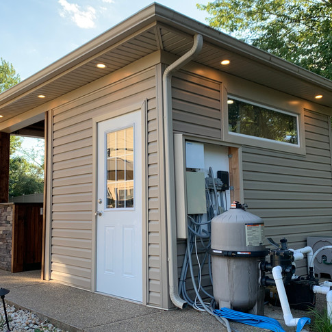 The exterior of the structure is sided in PlyGem brand Mastic premium vinyl siding in the Carvedwood44® series double 4.5” dutch lap style and pebblestone clay color. We installed slate colored GAF Timberline dimensional architectural shingles on the roof of the structure and chose gutters and trim to compliment the siding and overall look. To complete the exterior we installed StoneCraft branded stone veneer on the face of the bar in the Ledgestone style and Tennesse color. We also installed LED recessed lighting on the outside area of the ceiling as well as LED accent lighting on underside of countertop to create nighttime vibes. Lastly, we added a pull down exterior grade wall of curtains custom fit to size to help protect the interior of the space from the weather when the bar area is not in use.
